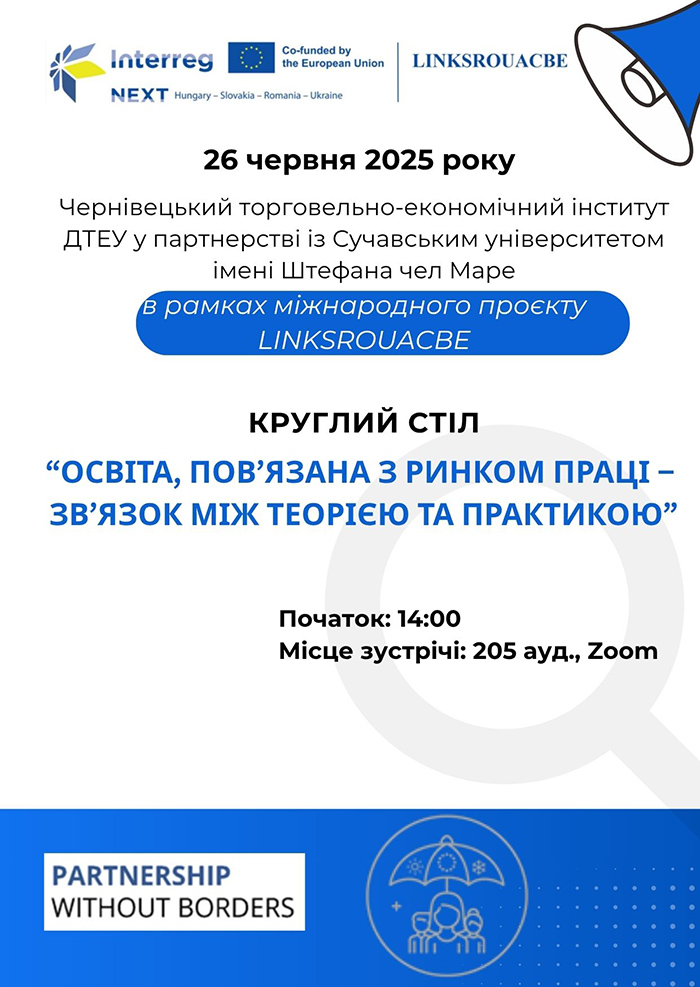 On November 26, 2025, the Chernivtsi Institute of Trade and Economics of SUTE in partnership with the Stefan cel Mare University of Suceava (Romania) held a round table "Inclusive and Digital Economy in the Process of Ukraine's Integration into the European Space: Education, Innovation, Business" within the framework of the international project "Links between Theory and Practice in Cross-Border Education in Romania and Ukraine" (LINKSROUACBE), HUSKROUA/23/RS/3.1/043. The representatives of local government, education and business were the guests of the event. The ChITE SUTE teachers and students also participated in the event.